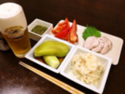 大根とほたてのサラダ(昨日の残り) 蒸しなす きのう仕込んだローストポークを少しだけ味見 めかぶ