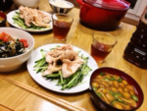 春野菜の豚こま巻き蒸し かぶの浅漬け 大根と油揚げとかぶの葉のお味噌汁