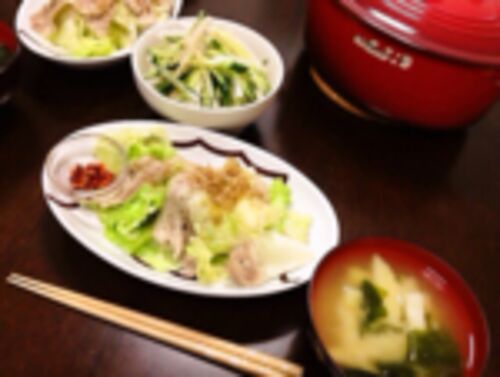 豚バラきゃべつ蒸し 大根ときゅうりのサラダ じゃがいもとわかめのお味噌汁