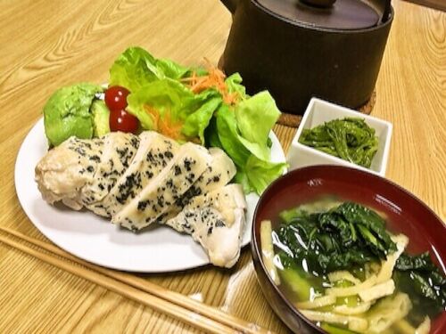 バジルチキン サラダ菜とアボカドとトマト めかぶ ちぢみほうれん草と油揚げのお味噌汁