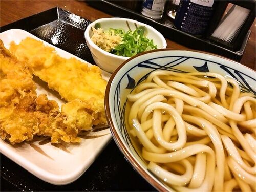 うどんと鱧とかしわ天 ねぎと生姜をどっさりと