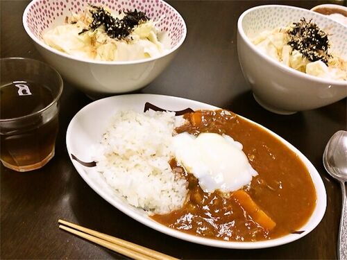 牛すじとトマトのカレー 温玉のせ 蒸しきゃべつ 牛すじ、玉ねぎ、にんじん、生姜、トマト缶を圧力鍋でぶわーっと煮込んだカレーがとろろん。蒸しきゃべつには、沖縄みやげのラー油きくらげ佃煮をのせました。うんまい!