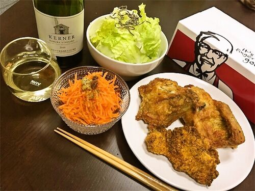 KFCとりの日パック にんじんレモンオリーブオイル和え レタスと塩昆布のサラダ ケルナー2016(木村ヴィンヤード) 仕事納めの12月28日はとりの日パックをモリモリ食べつつうまい酒を飲む、というのが半ば恒例行事化しつつあります。しあわせ…!
