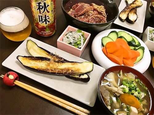 かつおごま醤油漬け 焼き茄子 ピーマンとしらすの白だし煮 きゅうりとにんじんのぬか漬け 根菜ときのこのお味噌汁(ごぼう、にんじん、こんにゃく、豆腐、油揚げ、刻み根昆布、干し椎茸、まいたけ、しめじ、小ねぎ) キリン秋味 秋味をお迎えするために茄子を…