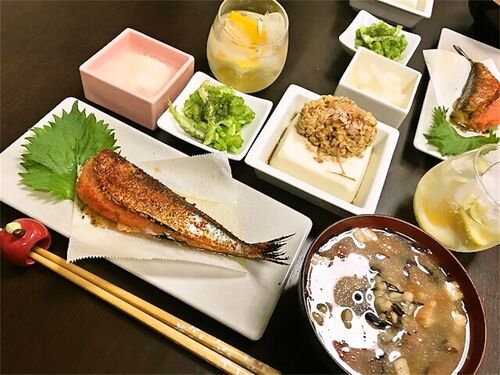 いわし明太子 納豆のせ冷奴 セロリのレモンマリネ ひじきともち麦とベーコンとトマトのお味噌汁 スイートスプリングのレモンサワー