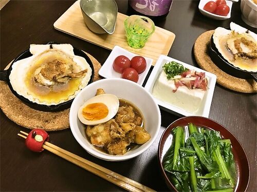手羽元の魯肉飯っぽい煮 ほたてにんにく魚醤焼き 兎豆屋さんのブレンド木綿にみょうが甘酢漬けと大葉 トマト白だし漬け 鷄だしで小松菜のお味噌汁 閉店間際の魚屋にて殻つきの立派なほたてが投げ売られておりましたので、そりゃもう買いますよねって話で。僥…