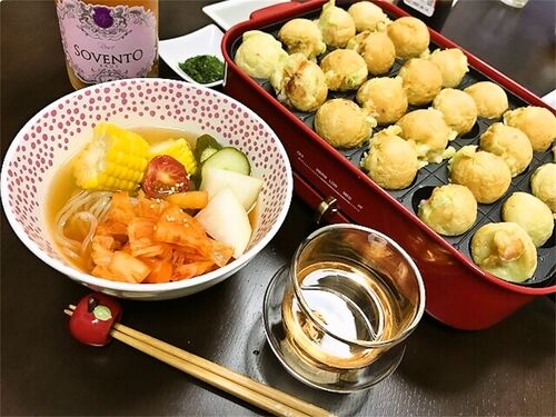 冷麺 たこ焼き ソヴェント・ブリュット・ロゼ 散歩の帰り、ぴょんぴょん舎の冷麺が赤札になってるのを見つけて迷わず購入。たまたま仕込み途中だった自家製水キムチの具(きゅうり・冬瓜・とうもろこし・トマト)をのせたらちょうどいい感じになりました。今日…
