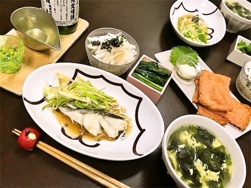 たら中華蒸し 島根の赤てん ほうれんそうのおひたし 大根サラダ ザーサイ入り中華たまごスープ