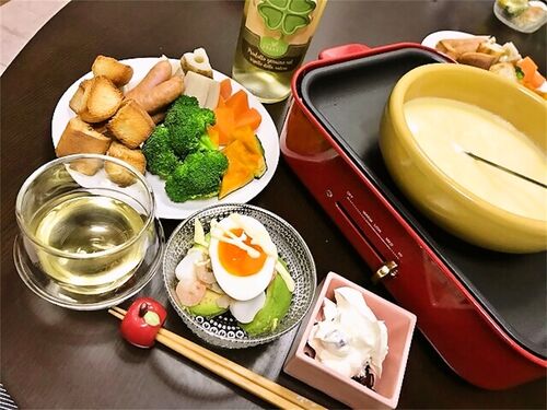 チーズフォンデュ(れんこん、にんじん、かぼちゃ、ブロッコリー 、パン、ウインナー) アボカドとシーフードミックスのサラダ マスカルポーネとほの甘蒸しあずき エティケ ヴィーニャプーラ ビアンコ