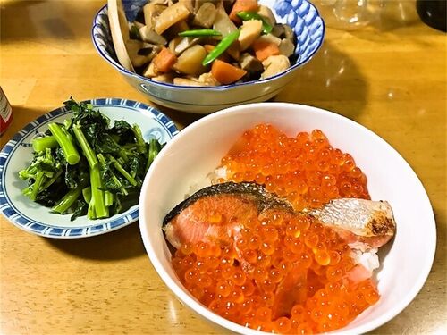 鮭といくらの親子丼 筑前煮 青菜のおひたし デザートに生檸檬 「生檸檬、こっちじゃ買えないんだよねえ…」としょんぼりしてたら「じゃあ一緒に食べよ!」と姉がお取り置きしてくれたので、こちらはお返しとばかり鮭といくらを送りつけておくことにしたのでし…