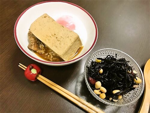 昨日の豚バラ軟骨の残りでとうめしもどき ひじきと蒸し豆