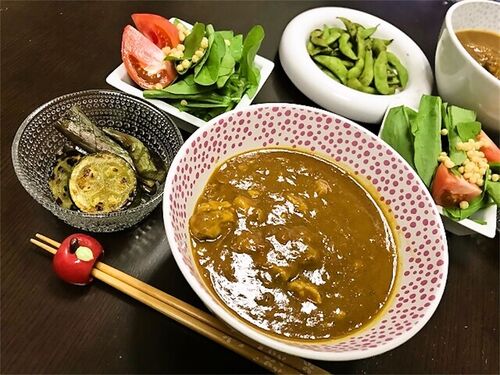 豚バラ軟骨カレーうどん 茄子とズッキーニの焼き浸し 焼き枝豆 ほうれんそうとトマトとキヌア