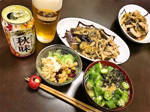 豚こまと茄子ときのこのオイスター醤油炒め 甘酒切干大根と蒸し豆のサラダ おくらとあおさのりのお味噌汁 秋味