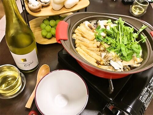 きりたんぽ鍋 マッシュルームのヌーシャテルチーズ詰め シャインマスカット 紫波熟成樽シャルドネ2016 ダシから野菜まで全てセットになったきりたんぽ鍋が届いたので、とっておきの白を開けてお迎えしました。うんまい!