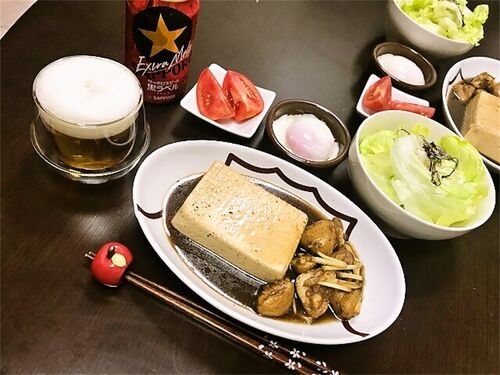 ぼんじりと豆腐のコーラ煮、温玉添え トマト レタスと塩昆布のサラダ サッポロ黒ラベル エクストラモルト コンビニのキャンペーンでもらったコーラ、夫もわたしも飲まないので肉を煮ました。ふわふわに煮えたのは炭酸のおかげ?それとも甘味かな。