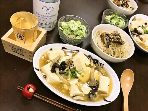 豆腐とひらたけの鯛だしとろみ煮 蒸しもやしといわし蒲焼缶はじかみ山椒のせ 岩下の新生姜ときゅうりの和えたの