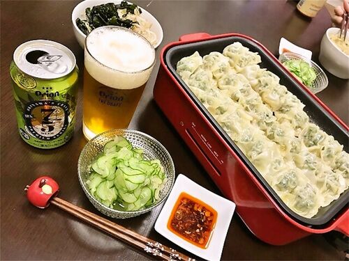 にらとどんこの餃子 もやしとわかめのサラダ きゅうりを岩下の新生姜で和えたの オリオン 75BEER IPA