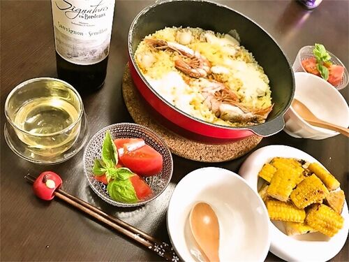 アルゼンチン赤えびとほたてのパエリア トマトとバジルのサラダ ガリバタ焼きとうもろこし ゴートチーズとナッツとカカオニブで二次会