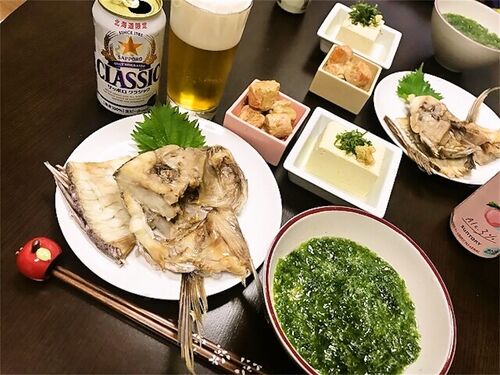 鯛あら塩焼き にんじんごま和え 冷奴 あおさのりのお味噌汁 サッポロクラシック