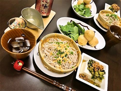 冷やしたぬきそば 山形のだしと納豆のせ冷奴 カリカリ焼きがんも 花陽浴 純米吟醸無濾過生原酒