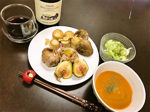 いちじくを豚肉で巻いてはちみつバターバルサミコ炒め えりんぎステーキ セロリのレモンマリネ にんじんの冷たいスープ