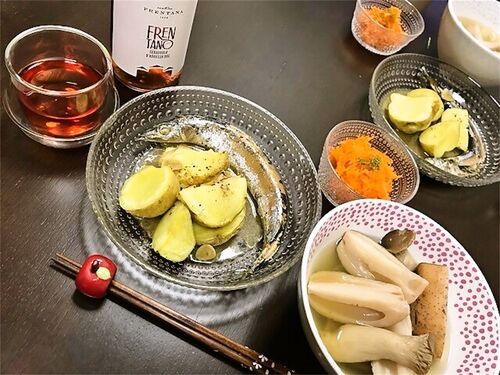 さんまのコンフィと蒸しじゃがいも にんじんサラダ 縦割りれんこんとえりんぎのスープ こないだ半分寝ながらみてたテレビの「80℃で8時間」というコメントだけを頼りに作ってみたコンフィ、さんまにふり塩してにんにくオリーブオイル絡めて低温調理器に放りこ…