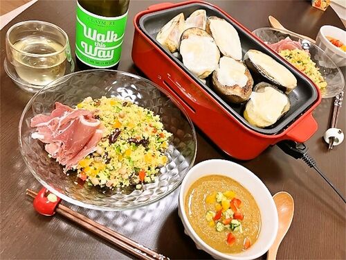 夏野菜のクスクスと生ハム 丸なすラクレットチーズ焼き ガスパチョ ウォーク・ディス・ウェイ クレア・ヴァレー リースリング 具材はいずれもきのう秋保で調達してきた野菜ですがクスクスはモルトビネガー、ガスパチョはシャインマスカット黒酢と異なる味で…