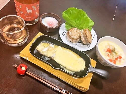 鶏むねれんこんはさみ焼きに温玉 紅はるかチーズ焼き(ラクレット、カマンベール) 根菜スープ 暮れに当たった泡パカのロゼ