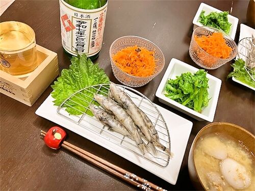めひかりの揚げない唐揚げ にんじん塩昆布和え わさび菜おひたし 里芋のお味噌汁