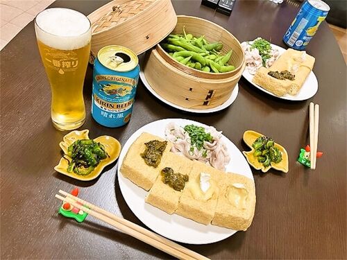 栃尾の油揚げにたらこ高菜とカマンベール ぽん酢冷しゃぶ 塩昆布ゴーヤ せいろ蒸し枝豆(田代農園の泉翠玉)