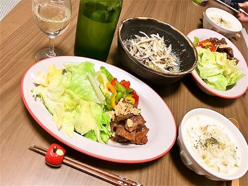 豚ハラミ焼きと温野菜 ごぼうとさつまいものごまサラダ ちくわと白菜のスープ
