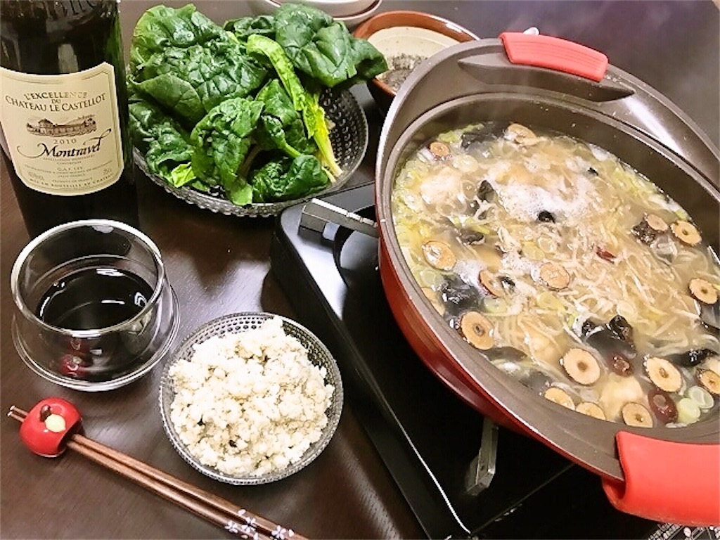 レシピはこちらを参考にしました。たこの代わりに素干しのホタルイカ、切干大根も入れて〆は十穀発芽玄米雑炊。あったまる〜|レンコンのすりおろしでやさしいとろみ。滋養たっぷり薬膳鍋 https://t.co/jVCYnz1hfV